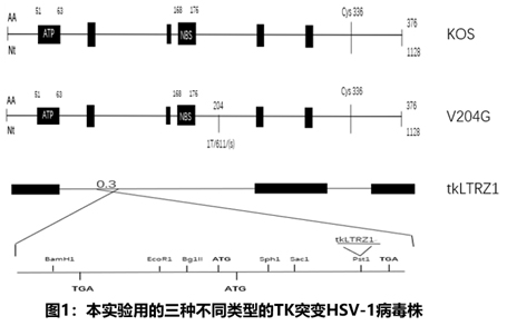 ACV是治疗HSV-1最主要的一线药物,是一种鸟嘌呤类似物,可以在DNA合成的水平上抑制病毒复制。ACV可以减轻疾病的损伤程度,减少到达感觉神经细胞的病毒量。ACV耐药(ACVr)病毒会给治疗带来巨大的挑战。在95%的临床耐药病毒株中,突变位点发生在胸苷激酶(TK)基因上。TK是病毒实现复制自身产生的一种蛋白酶,参与病毒的DNA合成,另一方面,ACV发挥作用也需要TK的参与。大约一半的TK突变为点突变,经常发生在ATP结合或者核酸结合位点等保守域内。根据突变后的TK活性,把TK突变分为三类TK(无TK活性),TKlow(低TK活性),TKaltered(较高程度上磷酸化底物胸腺嘧啶,磷酸化ACV的能力降低)。最后一种突变在ACV治疗中体现了选择优势。