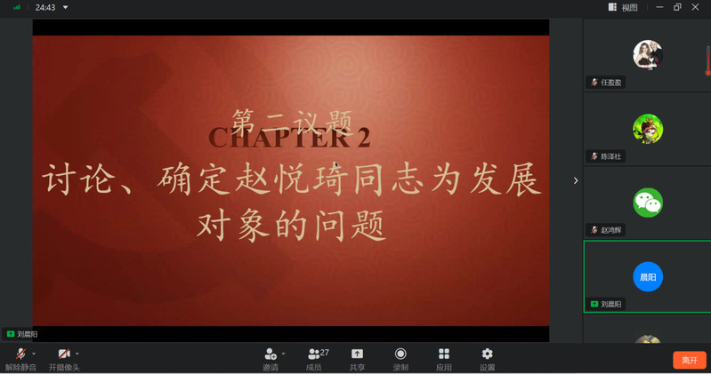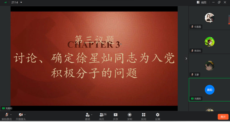 党课学习结束后,支部逐个讨论、确定了殷思慜、赵悦琦、严钦耀、郑彤彦同志为发展对象,以及徐星灿、董柳意、冯诺、顾飞、张藏磊、韩宏锐、李兴乐、张红未、朱景月同志为入党积极分子,并指派了相应的入党介绍人和入党联系人。