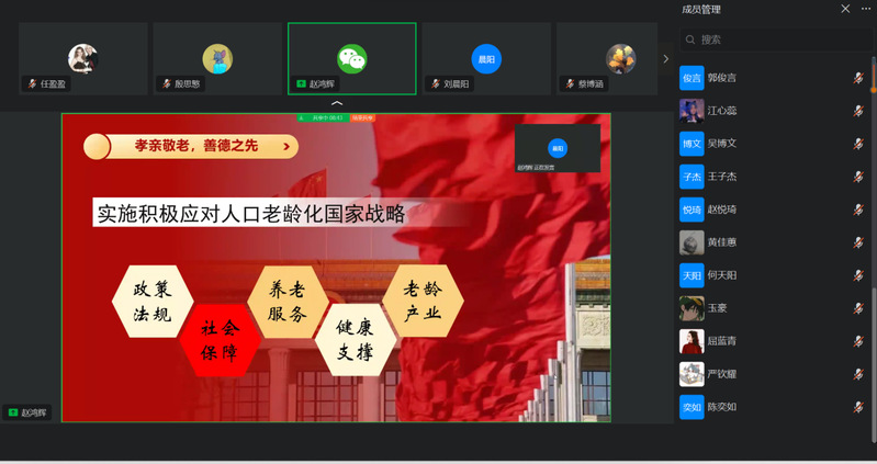 学长的分享使我感悟颇深,对于中国这样一个面临重大老龄化问题的人口大国,急需党带领国家制定正确的政策方针,各级政府制定详尽的方案保障关怀老年人政策的落实,社会也需要形成“尊老敬老爱老”的良好风气,而在这一过程中,青年人尤其是青年党员的引导与付出极为关键。“东隅已逝,桑榆非晚”,老年群体关怀,任何时候都绝不会晚!